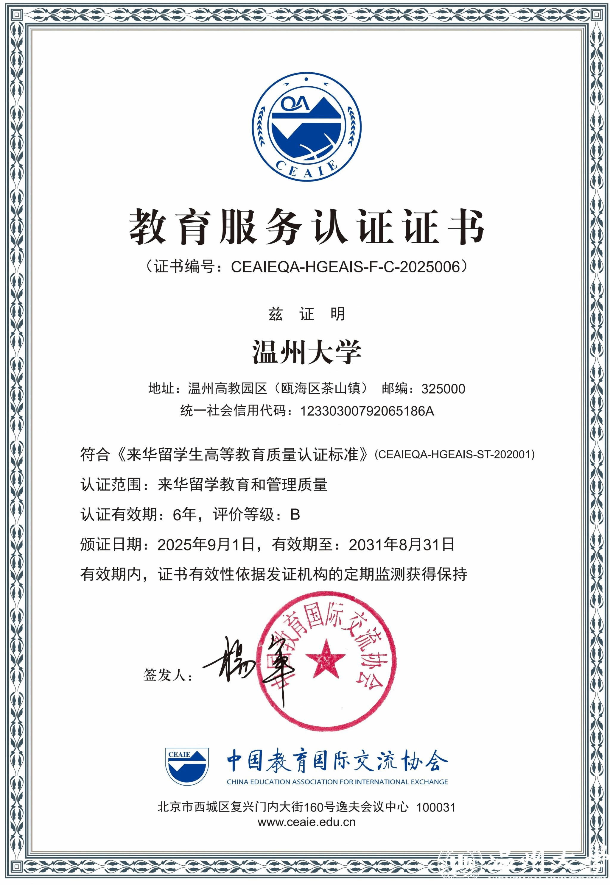 Oct. 30, 2025—Wenzhou University (WZU) has earned a six-year accreditation with a 'Grade B' rating, which is the highest rank for first-time participants, for the quality of its education for international students. The recognition was announced at the 26th China International Education Annual Conference, hosted by the China Education Association for International Exchange (CEAIE) in Beijing.