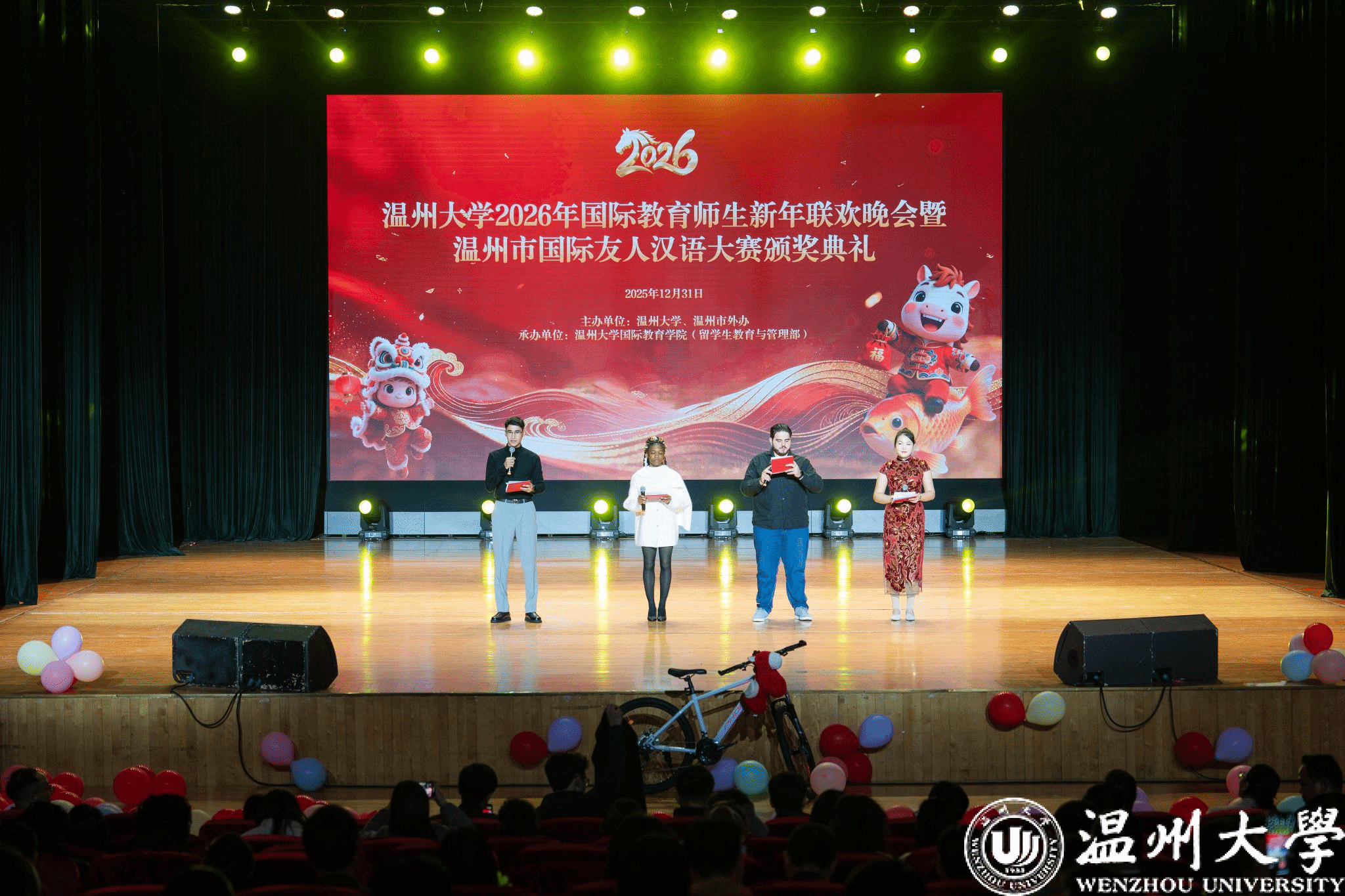 December 31, 2025, College of International Education(CIE) hosted its International New Year Gala and the award ceremony for the Wenzhou International Friends Chinese Competition at the Yuying Auditorium, celebrating cultural exchange and student achievements.