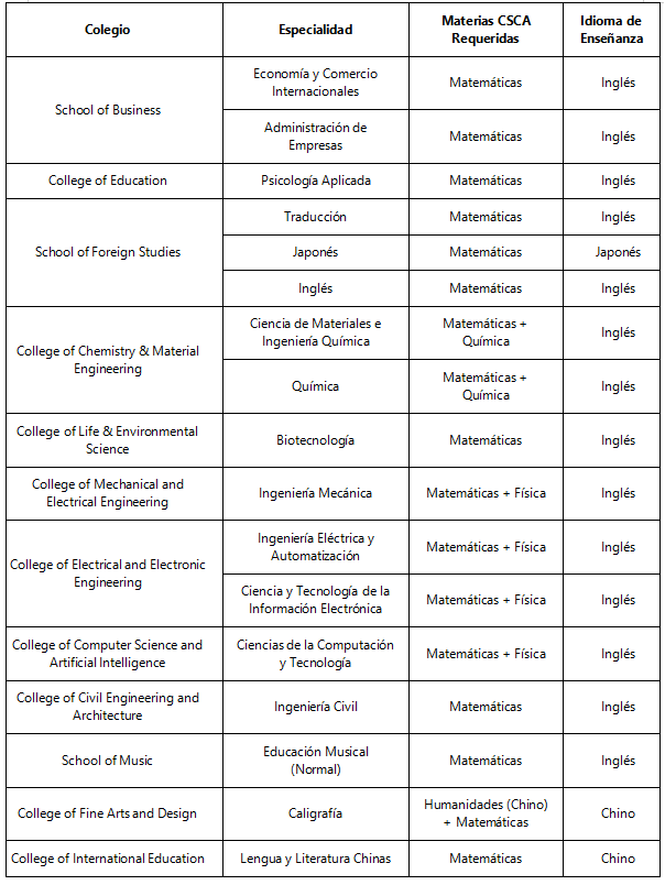 Todos los estudiantes internacionales que soliciten programas de grado deben proporcionar un certificado válido de CSCA. Fechas e información en www.csca.cn. Las materias e idiomas se indican en el catálogo de programas.