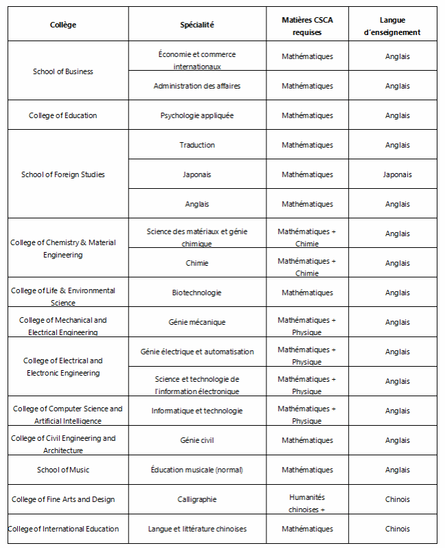 Tous les candidats à une licence doivent fournir un relevé de notes CSCA valide. Les dates sont publiées sur www.csca.cn. Les matières et langues du test sont indiquées dans le catalogue des programmes.
