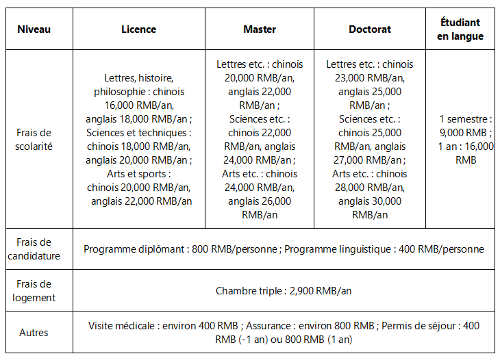 l Licence en langue et littérature chinoises : 18 000 RMB/an.